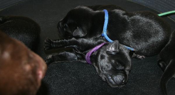 | DAY 5...Plump puppies, doubled birth weight Girls: purple and red Boys: green, blue and orange |
