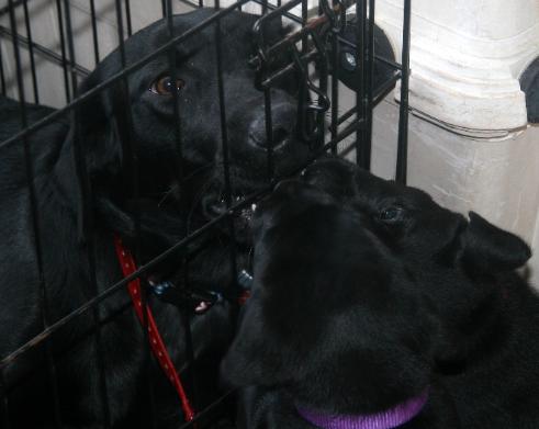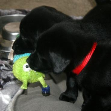 | Since large winter storm blew in, puppies got some house time. Exposed to load noises on TV, cooking smells, and meeting big dogs. |