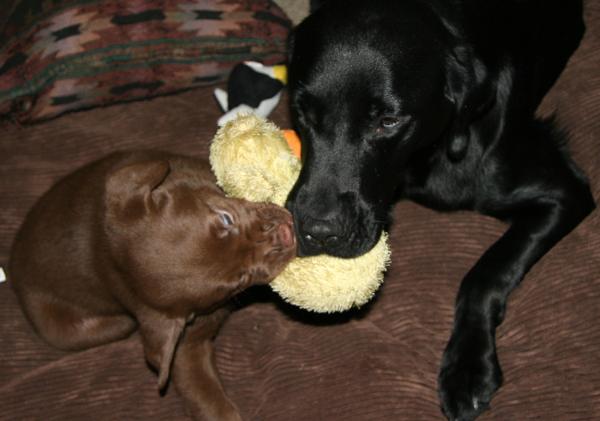 Chili having fun with her puppies