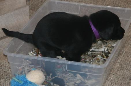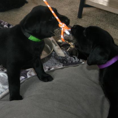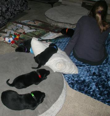 | Since large winter storm blew in, puppies got some house time. Exposed to load noises on TV, cooking smells, and meeting big dogs. |